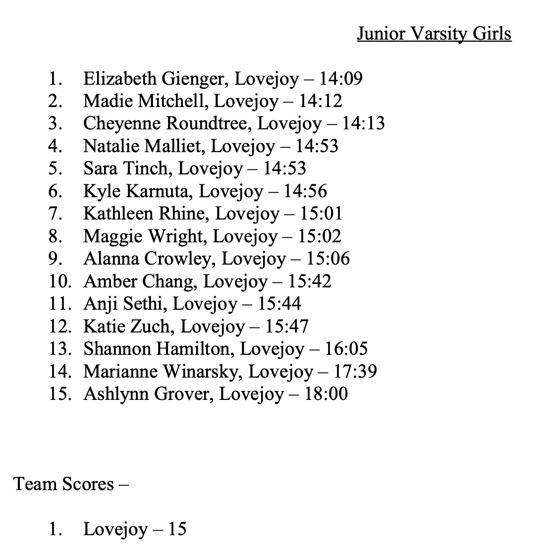 Coach Littlefield had also wanted a perfect score from her JV girls and she got it in spades: the first 12 finishers were Lovejoy and 21 of the top 25 were Lovejoy. Rather overwhelming. Note that 14 of the girls graduate this coming May, so next fall will present a coaching challenge for Coach Littlefield.