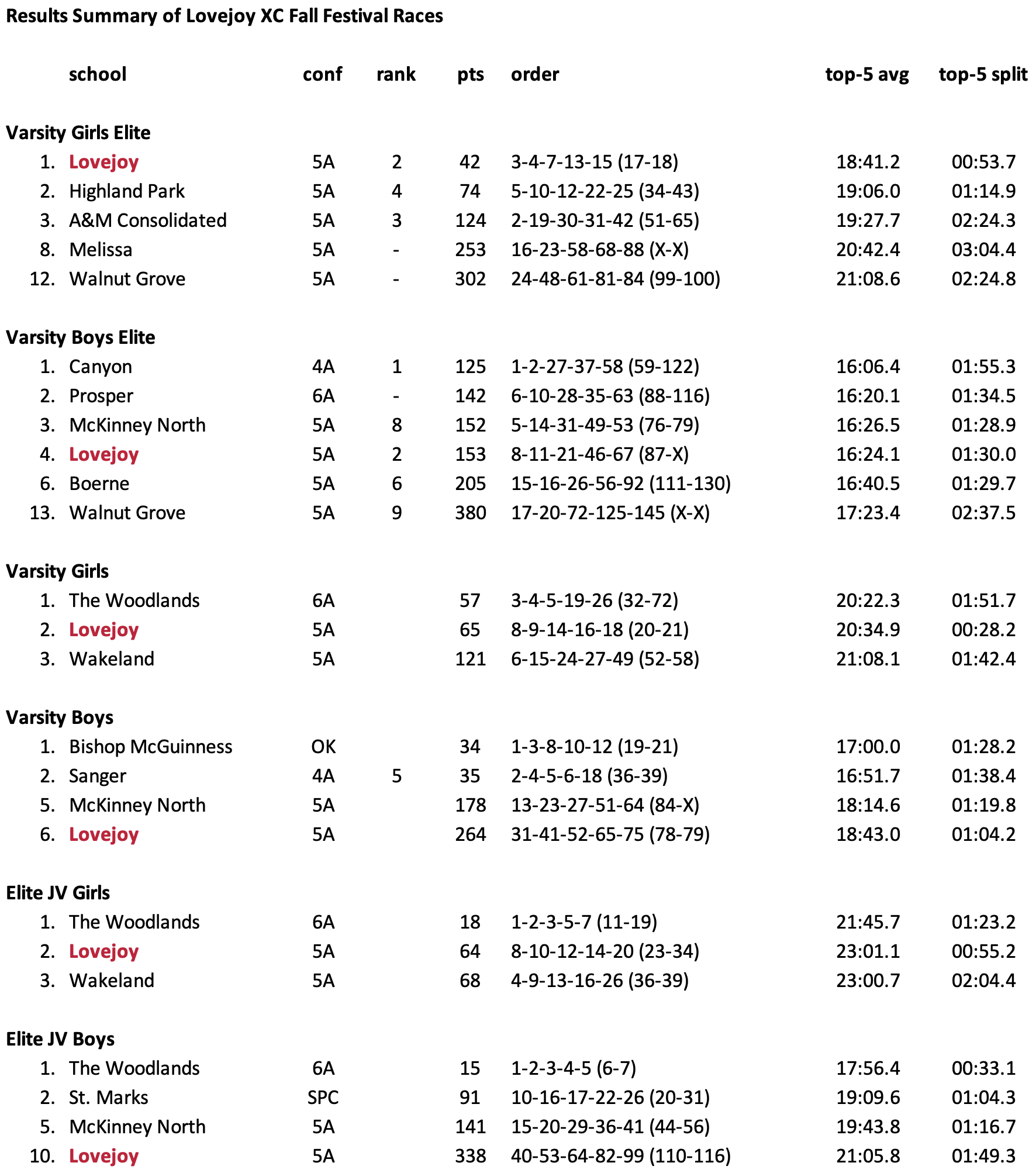 11 Lovejoy varsity runners saw significant (15 seconds or more) improvement over their times at this