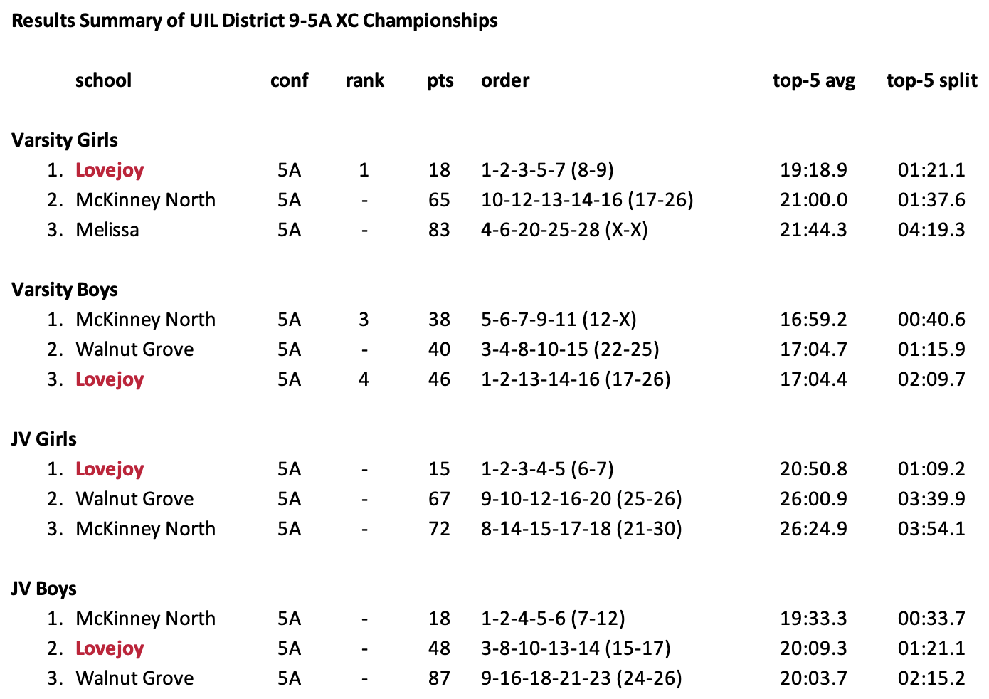 Finished 4th in the Open Varsity Boys race behind McKinney North, 6A Keller, and Melissa (running