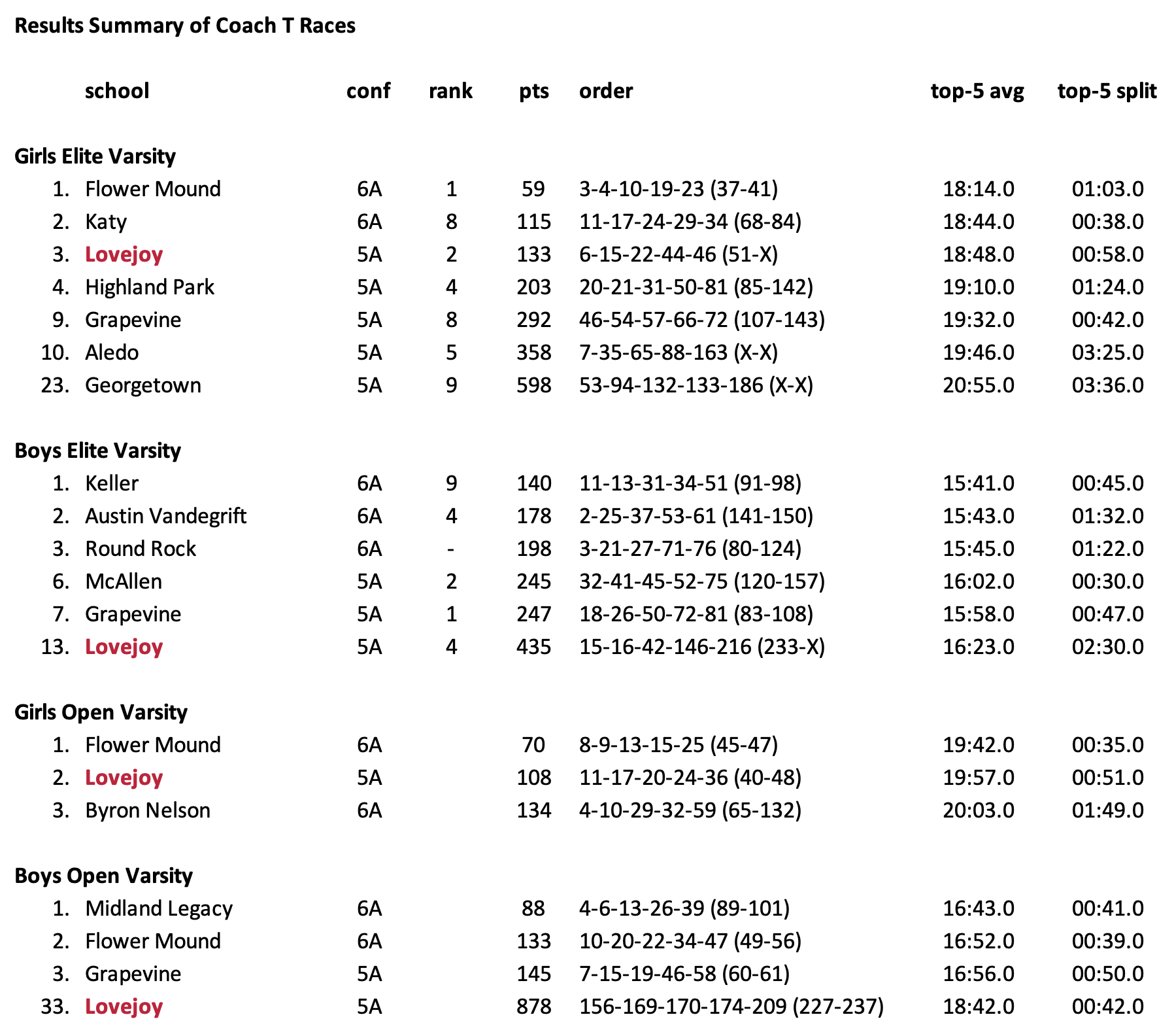 Finished 4th in the Open Varsity Boys race behind McKinney North, 6A Keller, and Melissa (running