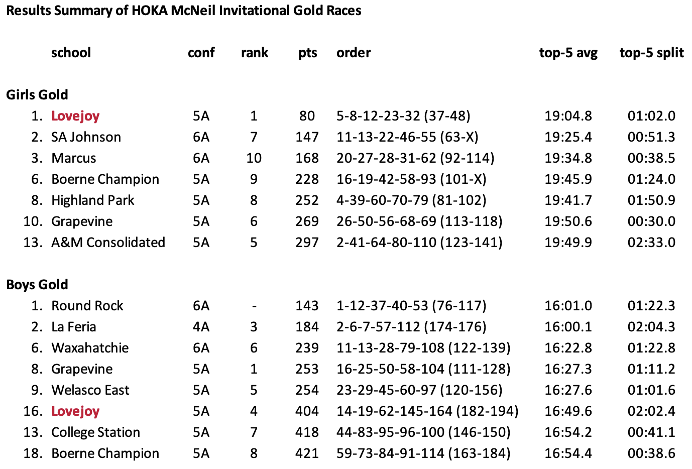 Lovejoy's top 15 girls did not compete today (they're headed to this Saturday's HOKA McNeil