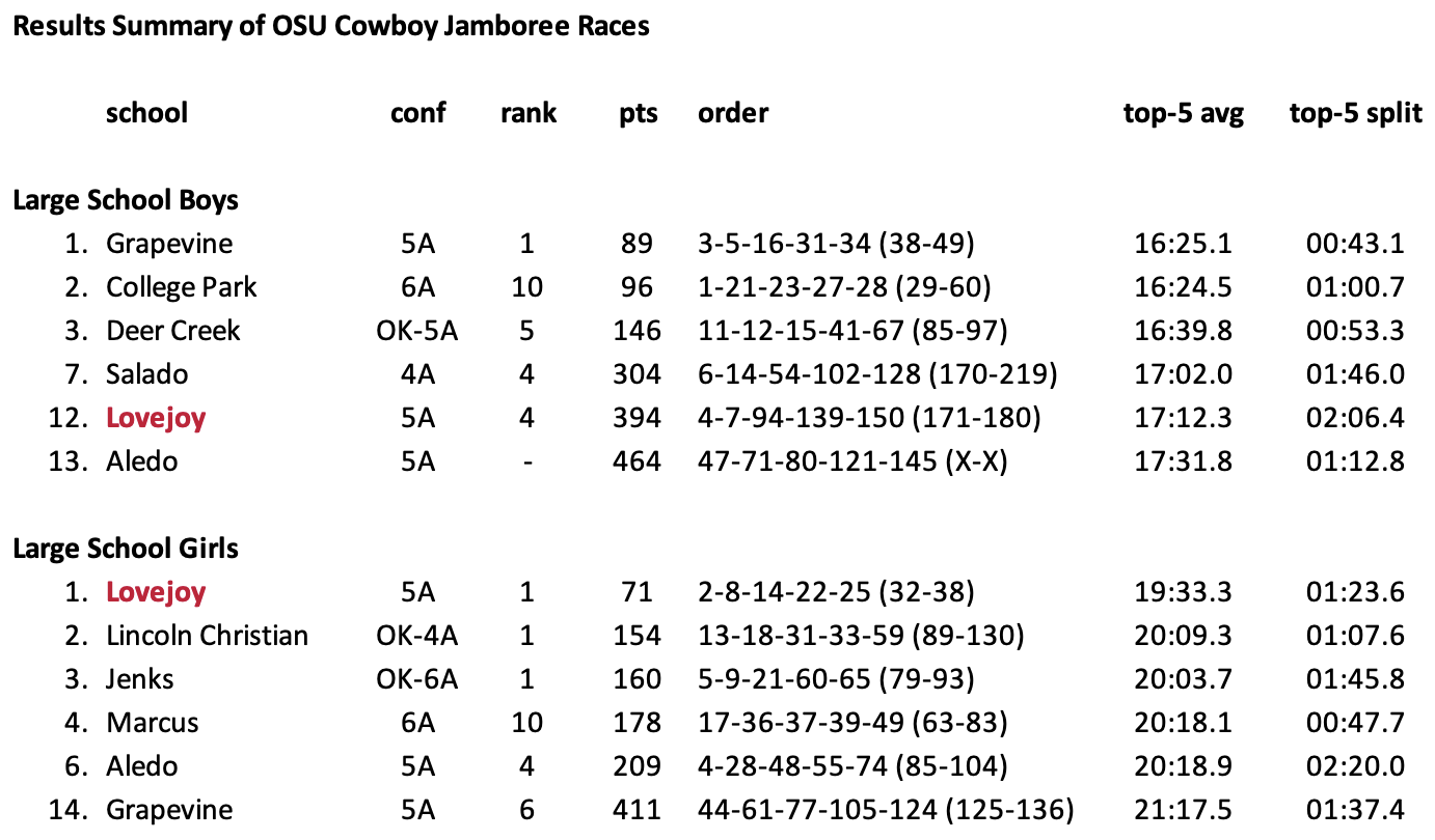 Lovejoy's top 15 girls and top 12 boys were in Stillwater for the Cowboy Jamboree